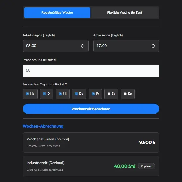 Anstatt jeden Tag einzeln auszurechnen, wählst du in unserem Rechner einfach den Reiter „Regelmäßige Woche“. Du trägst deine Zeiten nur ein einziges Mal ein, setzt die Haken bei deinen Arbeitstagen (z. B. Montag bis Freitag) und das Tool errechnet sofort dein Wochenergebnis von exakt 40 Stunden.