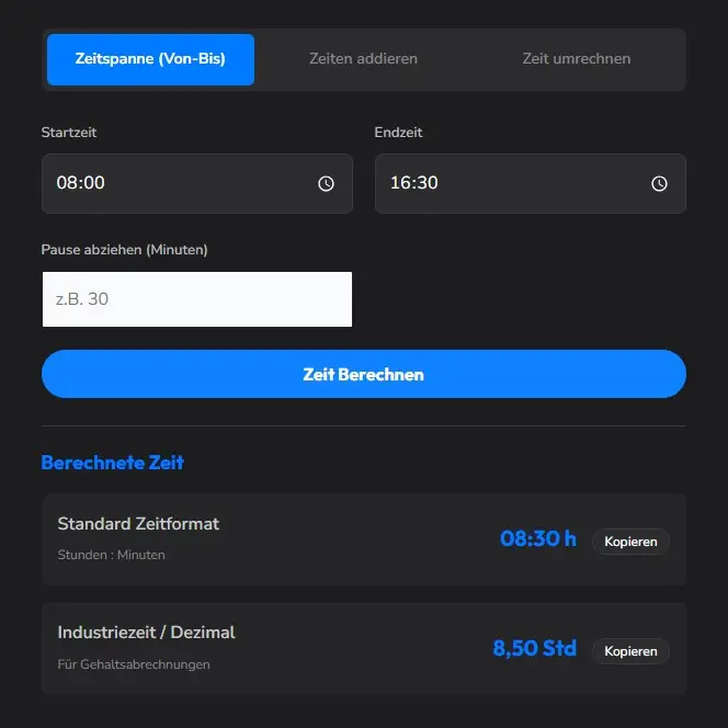 Nutze den Kopieren-Button neben dem Ergebnis, um den reinen Zahlenwert ohne störende Einheiten direkt in Excel, dein Rechnungsprogramm oder deine Zeiterfassung einzufügen.